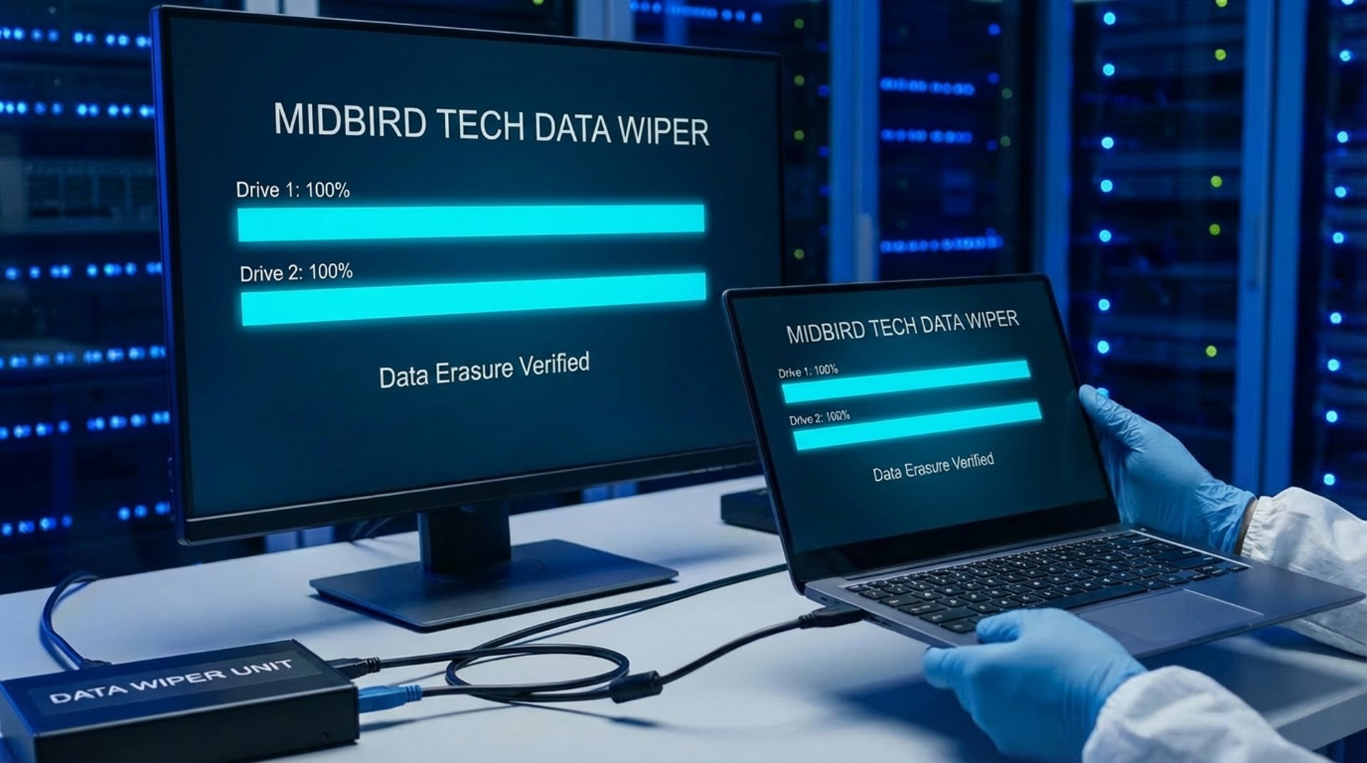 MidBird delivers complete, irreversible data erasure for laptops, servers, storage devices, and mobile assets — on-site or at our secure facility.