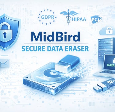 MidBird Technologies ensures 100% permanent data erasure backed by global standards — NIST, DoD, GDPR & HIPAA.